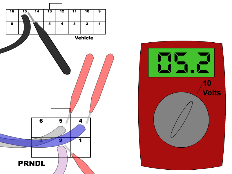 Put the black probe to main ground, where the wire connects to the battery, and test each wire of the PRNDL connector with the red probe.