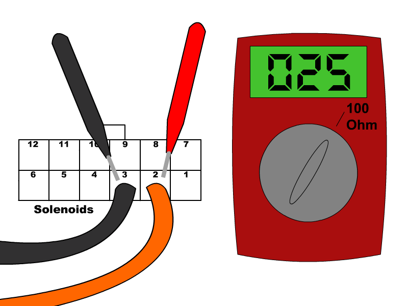 Remove the Solenoid connector from the controller. Measure the resistance between pins 2 (Orange) and 3 (Black).