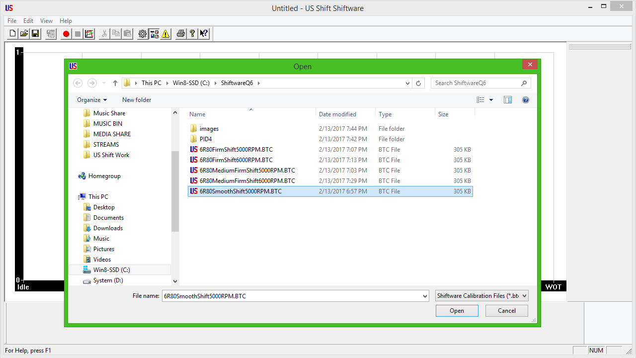 Select one of the default calibrations you wish to use, such as "6R80SmoothShift5000RPM.BTC". You will be able to modify the calibration to your liking later.