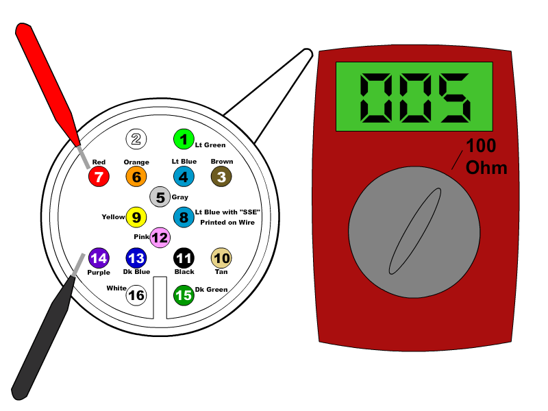 Remove the main bulkhead connector from the transmission. With the key off, use the diagram below as a guide to locate the correct pins at the transmission connector. Measure the resistance at the main transmission connector by probing the red lead to pin 7 (red wire) and the black lead to pin 14 (purple wire).